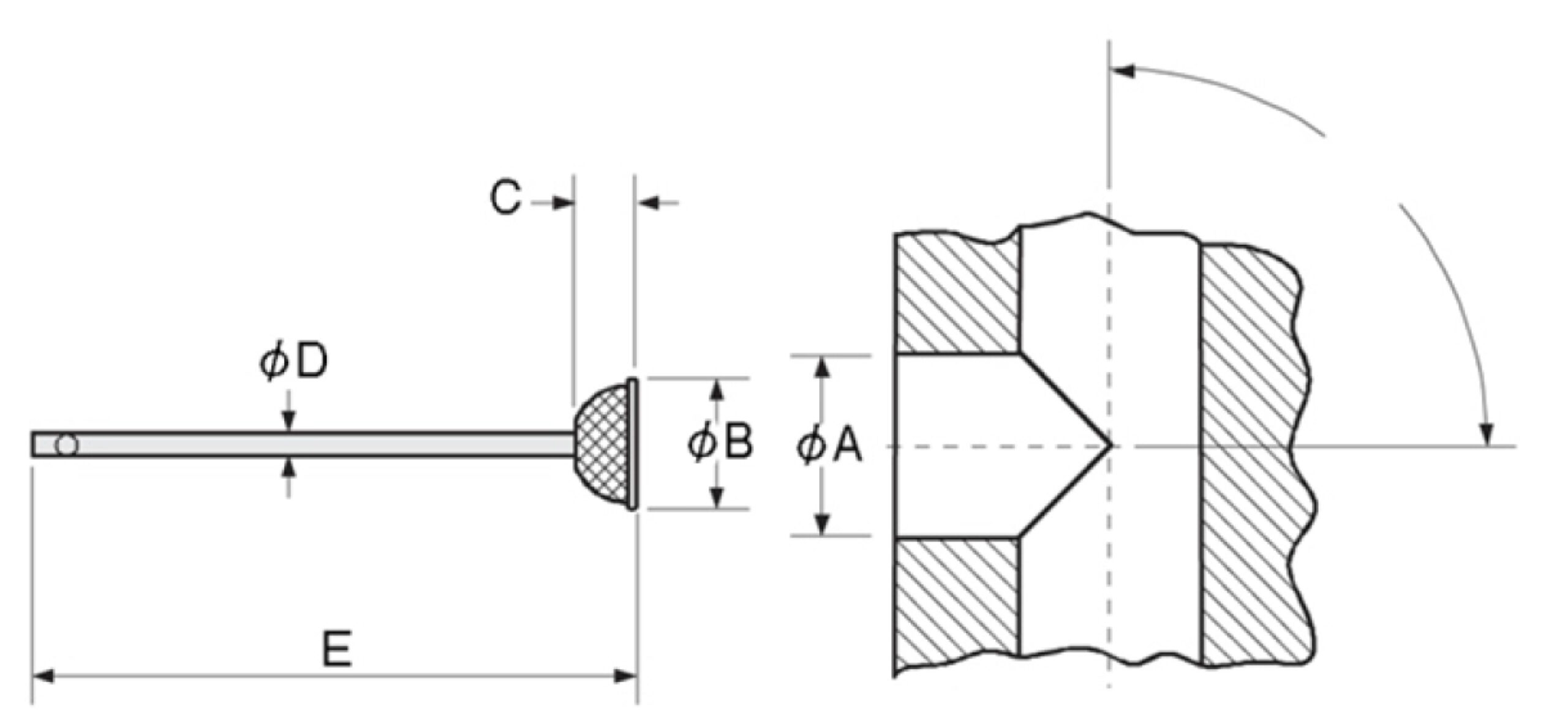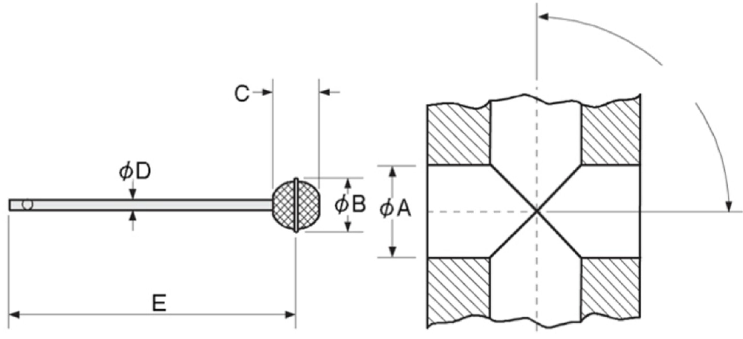 | Sipariş No'ları Kesici Ölçüleri mm/inch | Yaklaşık Min. Delik Çapı A giriş açısına göre değişir | Ø B Koruyucu Disk Çapı mm | C Kesici Kafa Yüksekliği mm | Ø D Kesici Sap Çapı mm | E Sap Uzunluğu mm | ||
