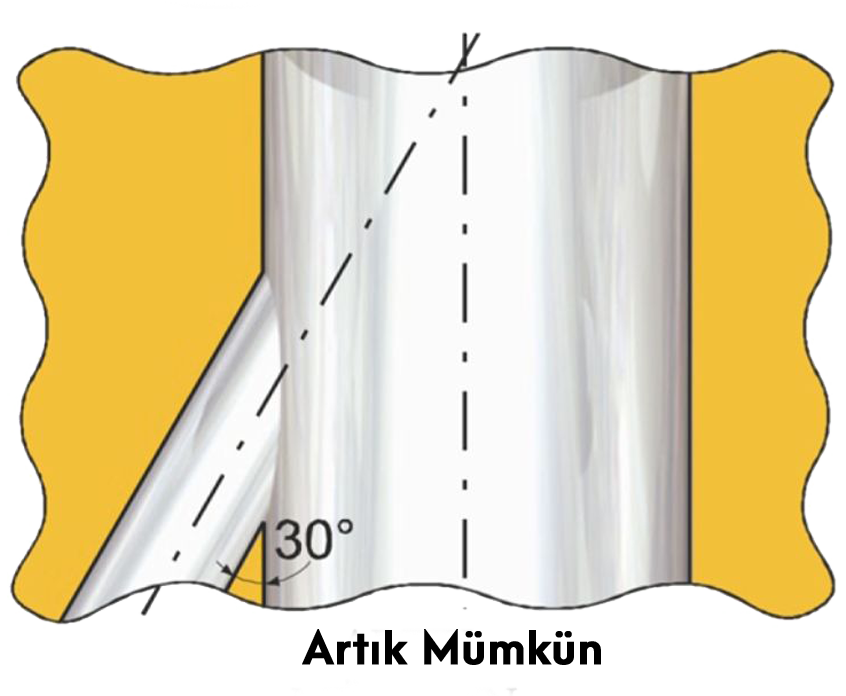 * Birbiri içine patlayan delik uygulamalarında, küçük deliğin ana deliğe yalnızca dikey (90º) patlıyor olması şart değildir. Orbitool® takımlarımız sayesinde; 60º, 45º ve hatta 30º’ye kadar dar açılardaki kesişim noktalarında bulunan ters köşe çapaklara erişebilirsiniz.