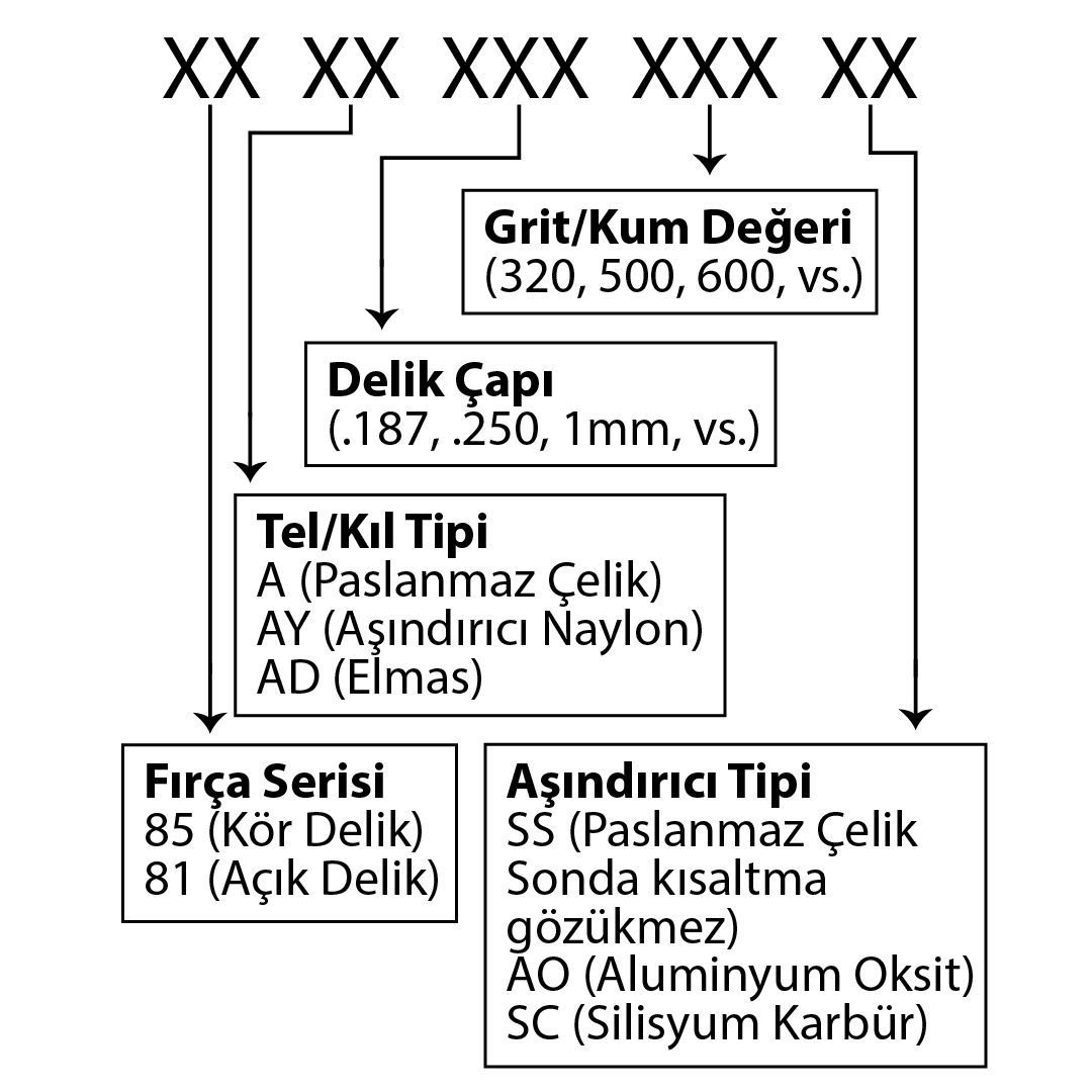 | Referans No | Delik Çapı | Fırça Çapı | Fırça Kısım Boy | Tüm Boy | Sap Çapı | Stokta Bulunan Aşındırıcı Tip |